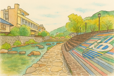 川沿いの風景と足湯が魅力の湯野温泉みどころ散策コース
